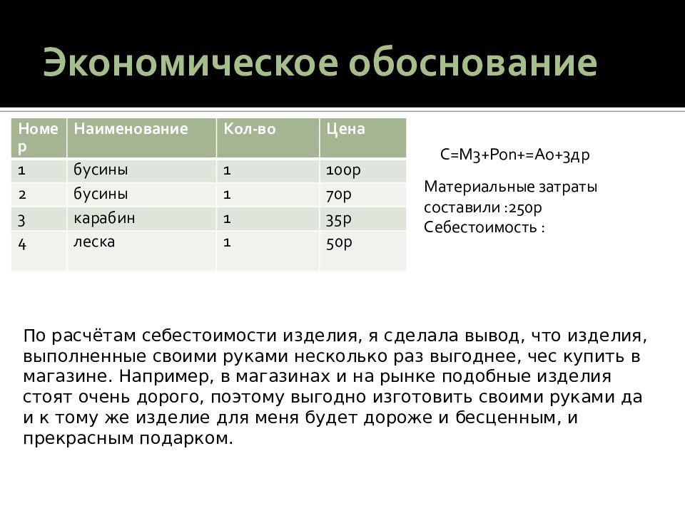 Номер Наименование Кол-во Цена 1 бусины 1 100р 2 бусины 1 70р 3 карабин 1 35р 4 леска 1 50р С=М3+Ро n+=Ao+3 др Материальные затраты составили :250р Себестоимость : По расчётам себестоимости изделия, я сделала вывод, что изделия, выполненные своими руками несколько раз выгоднее, чес купить в магазине. Например, в магазинах и на рынке подобные изделия стоят очень дорого, поэтому выгодно изготовить своими руками да и к тому же изделие для меня будет дороже и бесценным, и прекрасным подарком.
