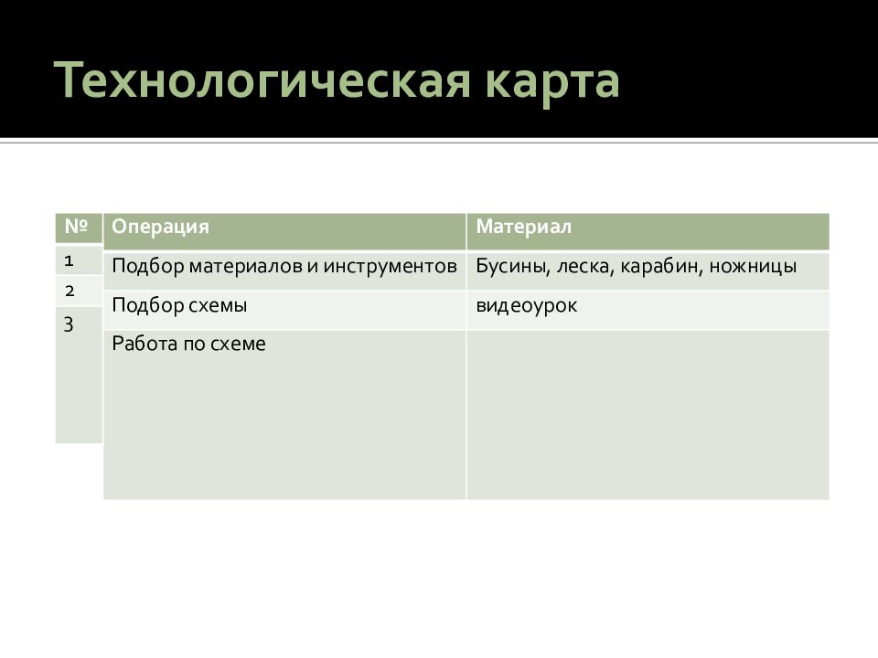 Операция Материал Подбор материалов и инструментов Бусины, леска, карабин, ножницы Подбор схемы видеоурок Работа по схеме № 1 2 3