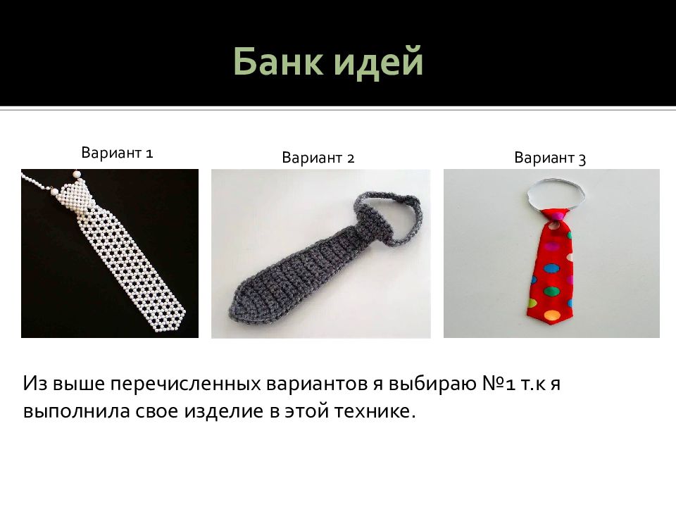 Вариант 1 Вариант 1 Вариант 2 Вариант 3 Из выше перечисленных вариантов я выбираю №1 т.к я выполнила свое изделие в этой технике.