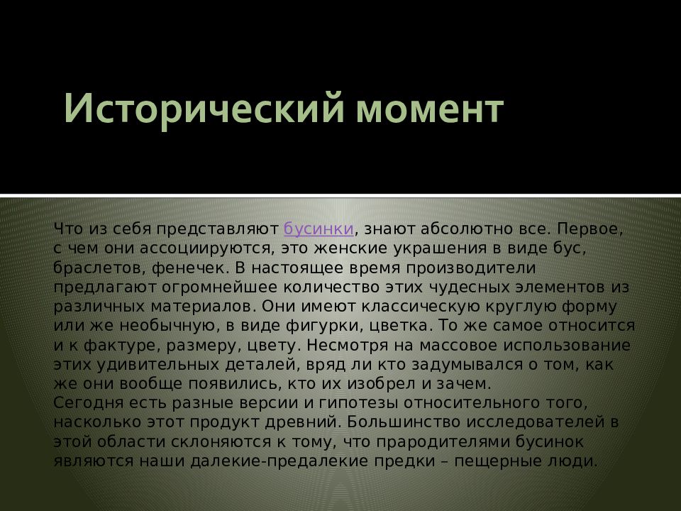 Что из себя представляют бусинки, знают абсолютно все. Первое, с чем они ассоциируются, это женские украшения в виде бус, браслетов, фенечек. В настоящее время производители предлагают огромнейшее количество этих чудесных элементов из различных материалов. Они имеют классическую круглую форму или же необычную, в виде фигурки, цветка. То же самое относится и к фактуре, размеру, цвету. Несмотря на массовое использование этих удивительных деталей, вряд ли кто задумывался о том, как же они вообще появились, кто их изобрел и зачем. Сегодня есть разные версии и гипотезы относительного того, насколько этот продукт древний. Большинство исследователей в этой области склоняются к тому, что прародителями бусинок являются наши далекие-предалекие предки – пещерные люди.