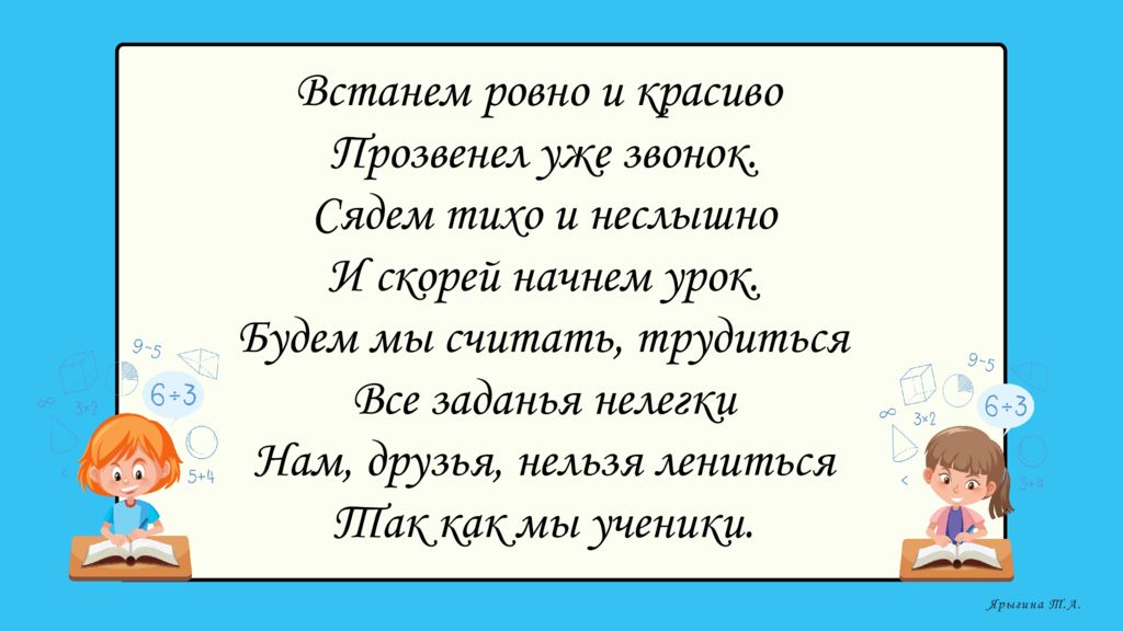 Встанем ровно и красиво Прозвенел уже звонок. Сядем тихо и неслышно И скорей начнем урок. Будем мы считать, трудиться Все заданья нелегки Нам, друзья, нельзя лениться Так как мы ученики. Ярыгина Т.А.