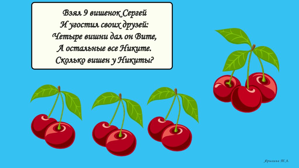 Взял 9 вишенок Сергей И угостил своих друзей : Четыре вишни дал он Вите, А остальные все Никите. Сколько вишен у Никиты ? Ярыгина Т.А.