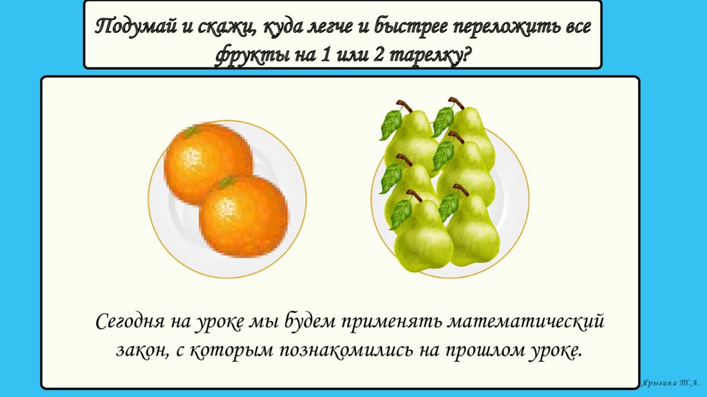 Подумай и скажи, куда легче и быстрее переложить все фрукты на 1 или 2 тарелку ? Сегодня на уроке мы будем применять математический закон, с которым познакомились на прошлом уроке. Ярыгина Т.А.
