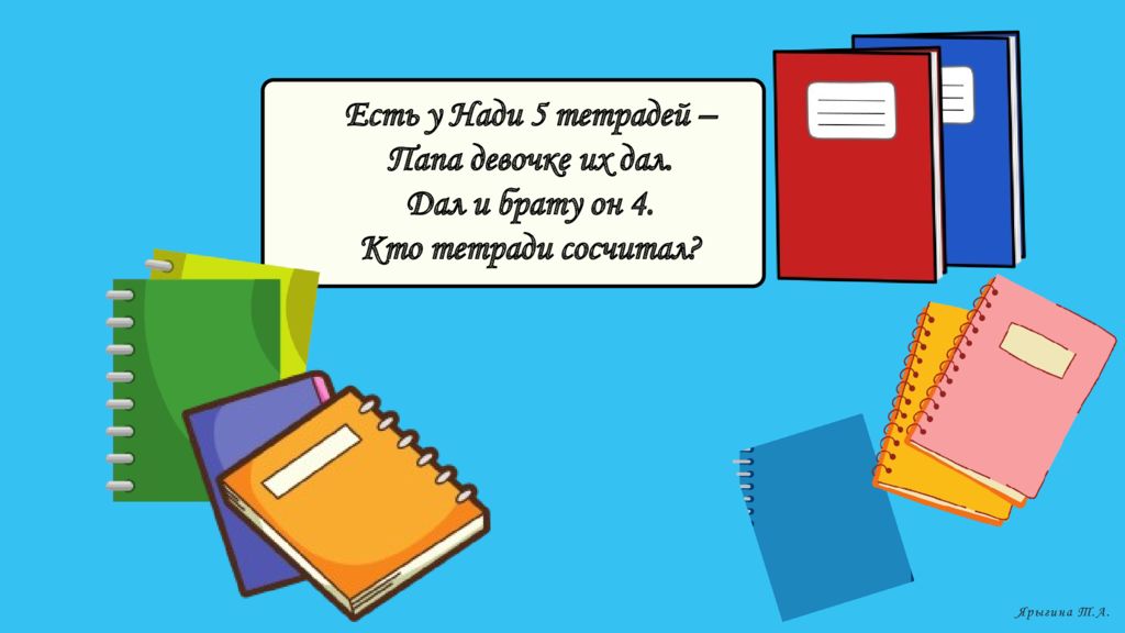 Есть у Нади 5 тетрадей – Папа девочке их дал. Дал и брату он 4. Кто тетради сосчитал ? Ярыгина Т.А.