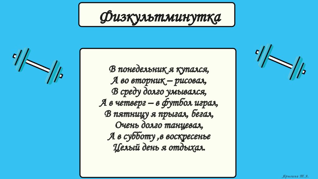 Физкультминутка Ярыгина Т.А. В понедельник я купался, А во вторник – рисовал, В среду долго умывался, А в четверг – в футбол играл, В пятницу я прыгал, бегал, Очень долго танцевал, А в субботу,в воскресенье Целый день я отдыхал.