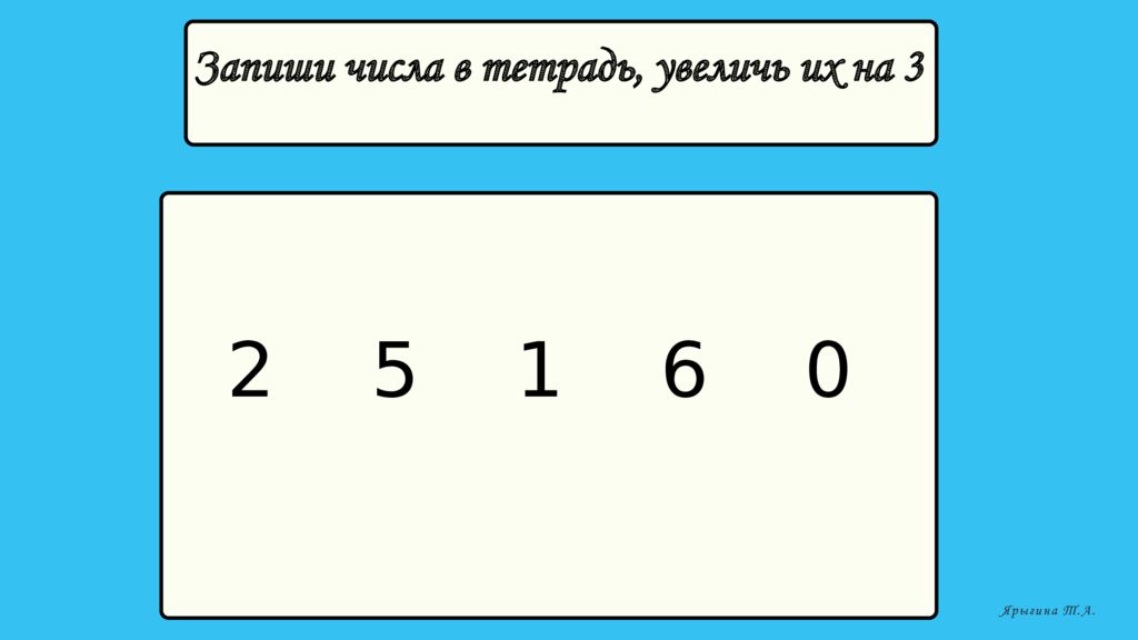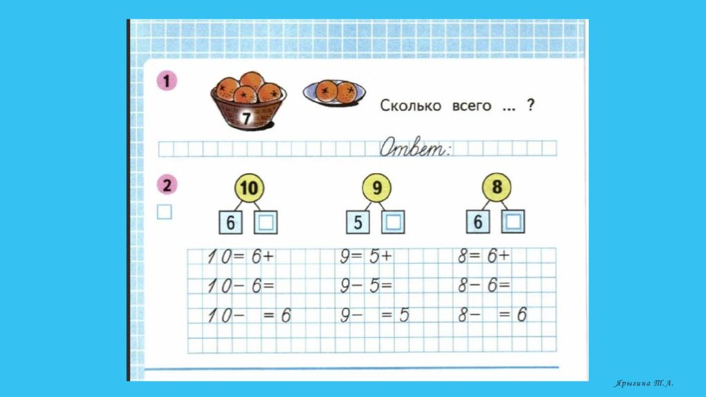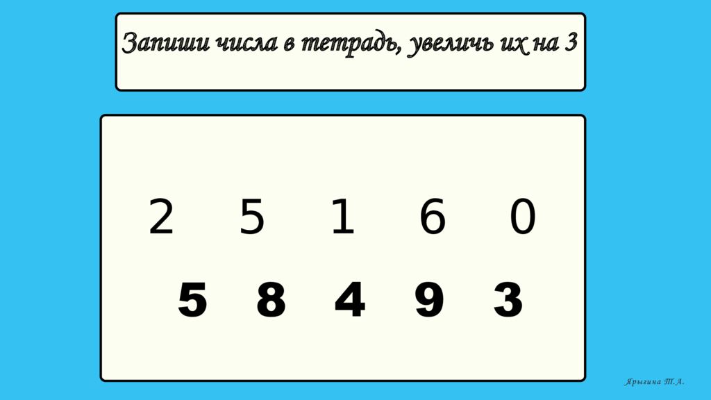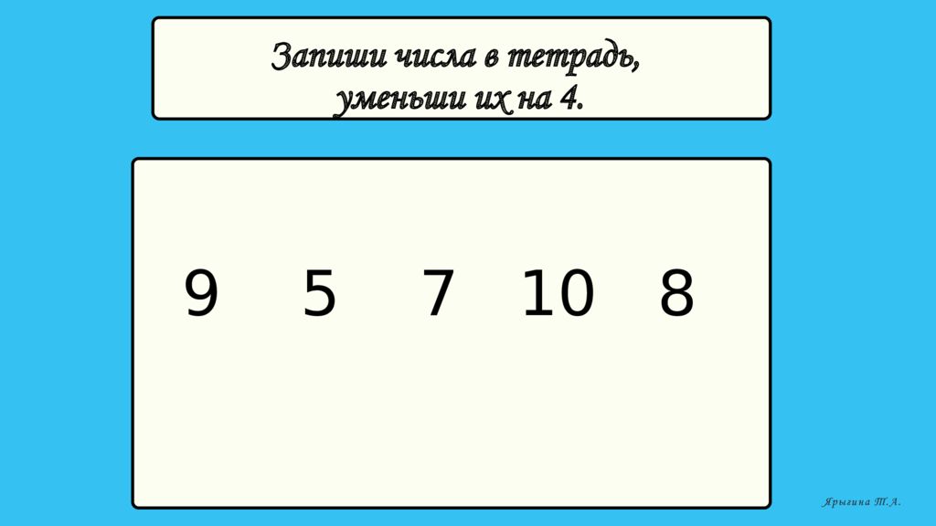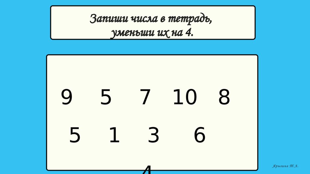 Запиши числа в тетрадь, уменьши их на 4. Ярыгина Т.А. 9 5 7 10 8 5 1 3 6 4