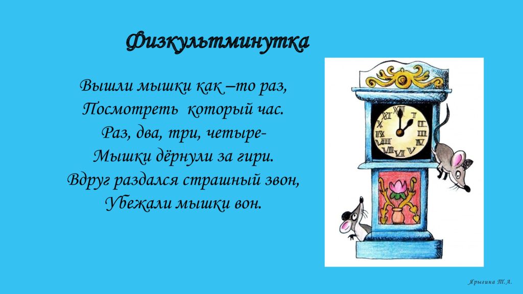 Физкультминутка Вышли мышки как –то раз, Посмотреть который час. Раз, два, три, четыре- Мышки дёрнули за гири. Вдруг раздался страшный звон, Убежали мышки вон. Ярыгина Т.А.