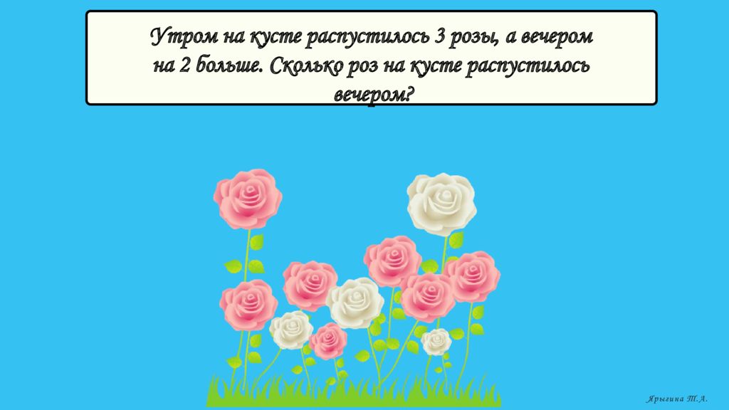 Утром на кусте распустилось 3 розы, а вечером на 2 больше. Сколько роз на кусте распустилось вечером ? Ярыгина Т.А.