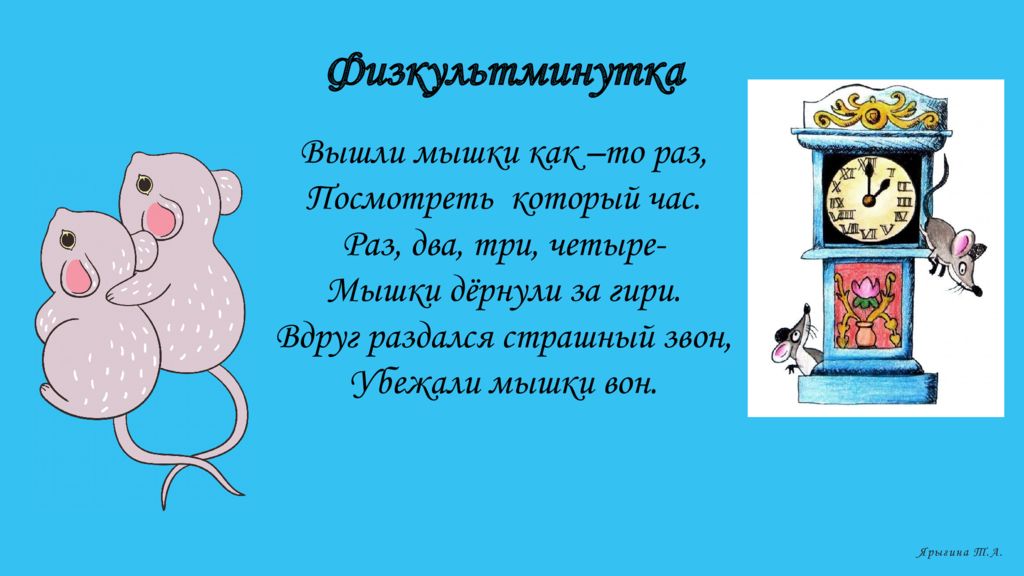 Физкультминутка Вышли мышки как –то раз, Посмотреть который час. Раз, два, три, четыре- Мышки дёрнули за гири. Вдруг раздался страшный звон, Убежали мышки вон. Ярыгина Т.А.