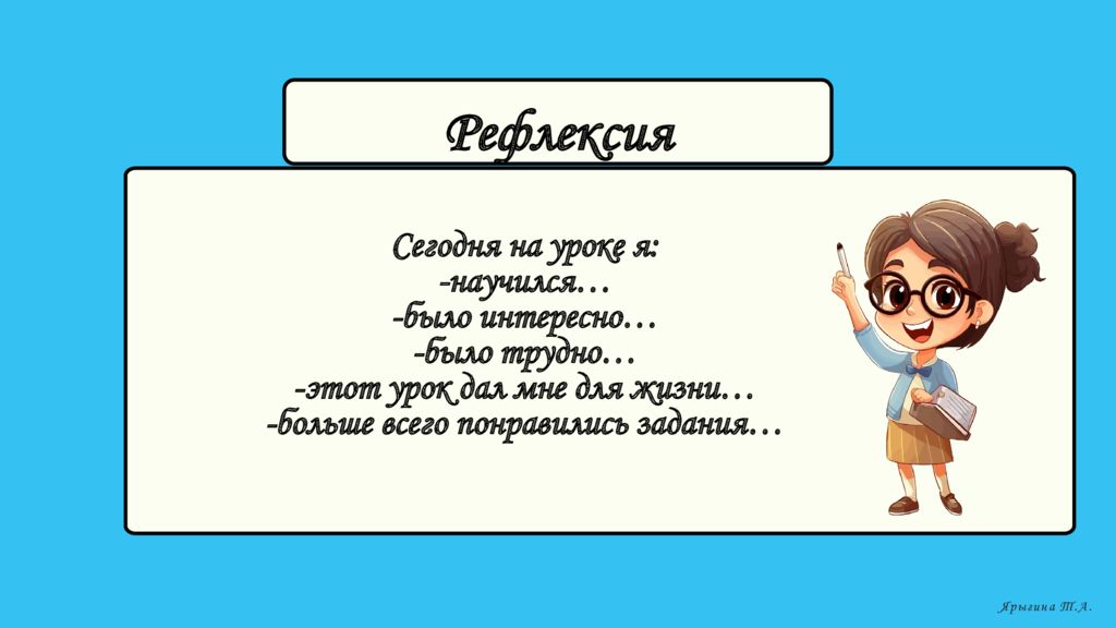 Рефлексия Ярыгина Т.А. Сегодня на уроке я: - научился … - было интересно … - было трудно … - этот урок дал мне для жизни … - больше всего понравились задания …