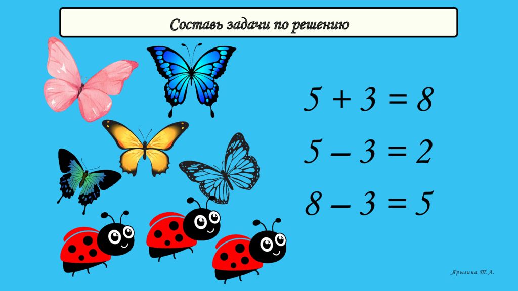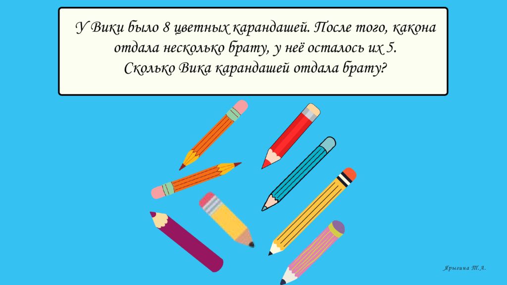 У Вики было 8 цветных карандашей. После того, какона отдала несколько брату, у неё осталось их 5. Сколько Вика карандашей отдала брату ? Ярыгина Т.А.