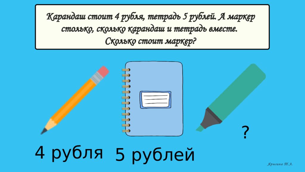 Карандаш стоит 4 рубля, тетрадь 5 рублей. А маркер столько, сколько карандаш и тетрадь вместе. Сколько стоит маркер ? 4 рубля 5 рублей ? Ярыгина Т.А.