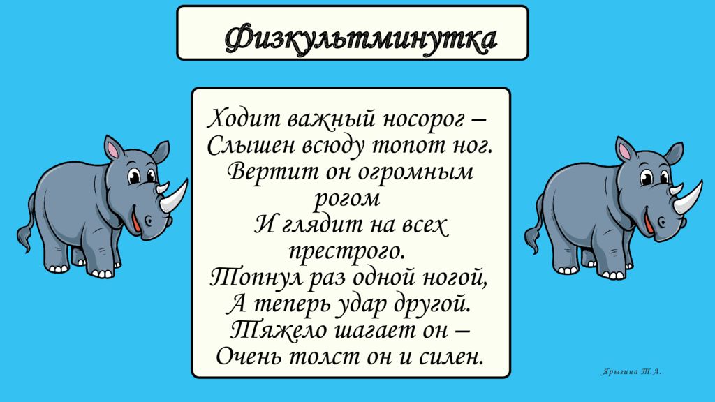 Физкультминутка Ходит важный носорог – Слышен всюду топот ног. Вертит он огромным рогом И глядит на всех престрого. Топнул раз одной ногой, А теперь удар другой. Тяжело шагает он – Очень толст он и силен. Ярыгина Т.А.