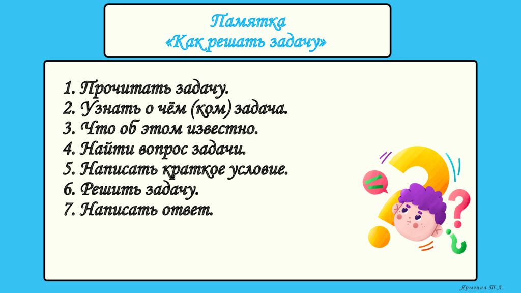Памятка « Как решать задачу » 1. Прочитать задачу. 2. Узнать о чём ( ком ) задача. 3. Что об этом известно. 4. Найти вопрос задачи. 5. Написать краткое условие. 6. Решить задачу. 7. Написать ответ. Ярыгина Т.А.