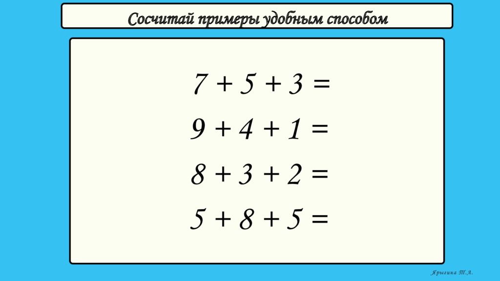 Сосчитай примеры удобным способом 7 + 5 + 3 = 9 + 4 + 1 = 8 + 3 + 2 = 5 + 8 + 5 = Ярыгина Т.А.