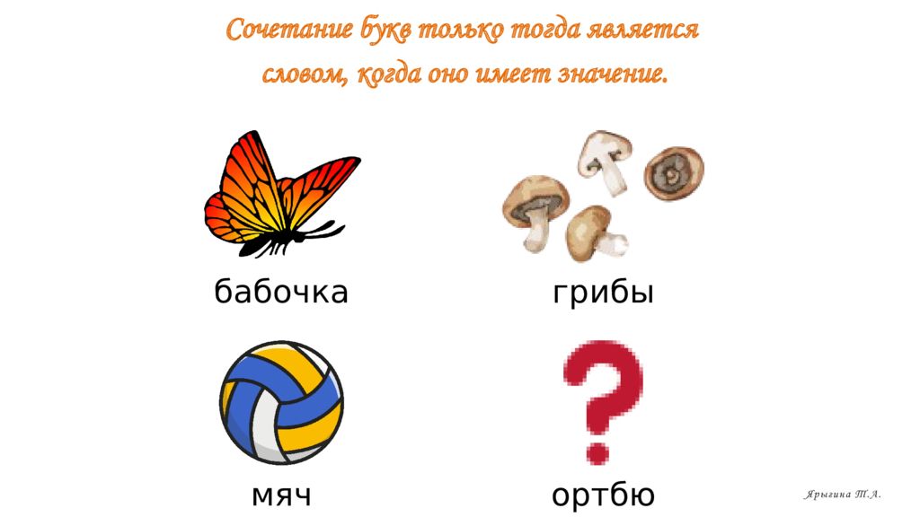 Сочетание букв только тогда является словом, когда оно имеет значение. бабочка грибы мяч ортбю Ярыгина Т.А.