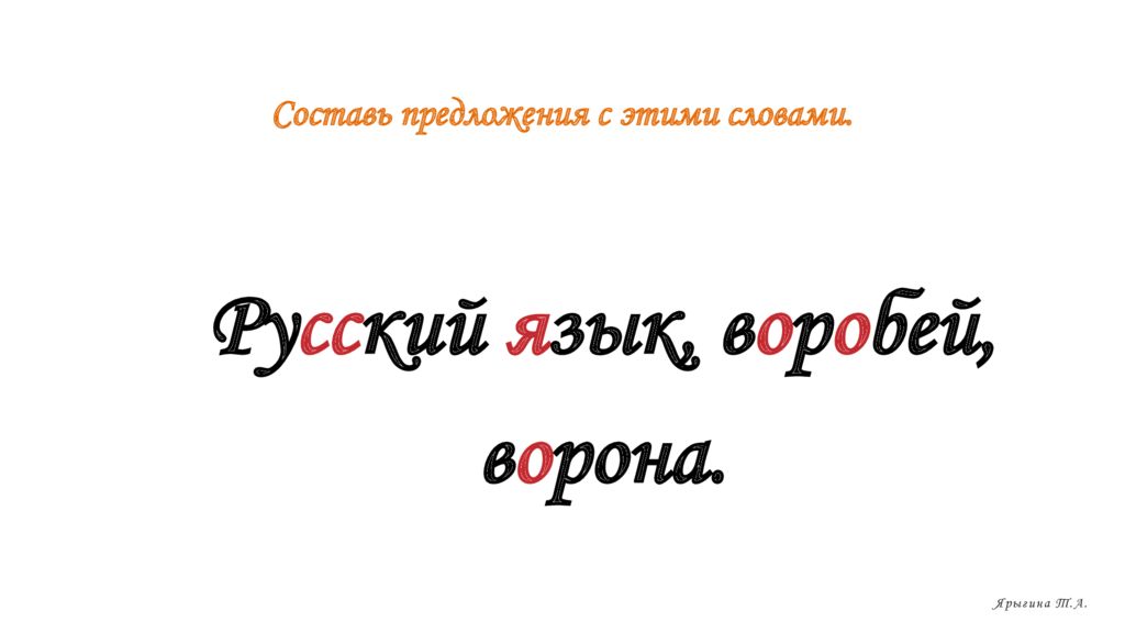 Составь предложения с этими словами. Ру сс кий я зык, в о р о бей, в о рона. Ярыгина Т.А.