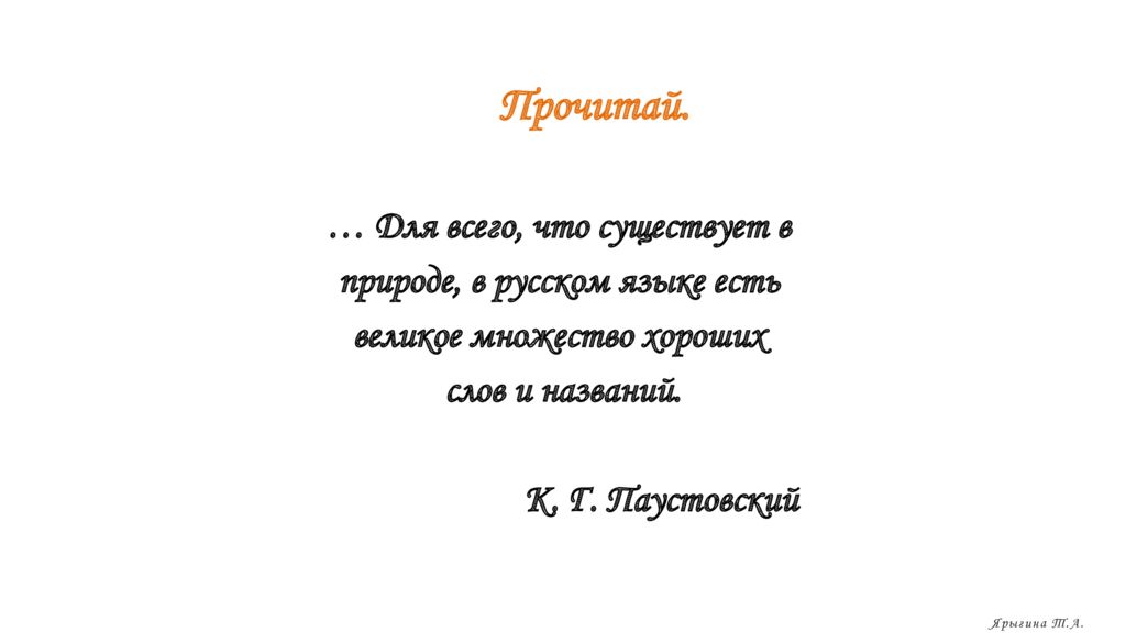 Прочитай. … Для всего, что существует в природе, в русском языке есть великое множество хороших слов и названий. К. Г. Паустовский Ярыгина Т.А.