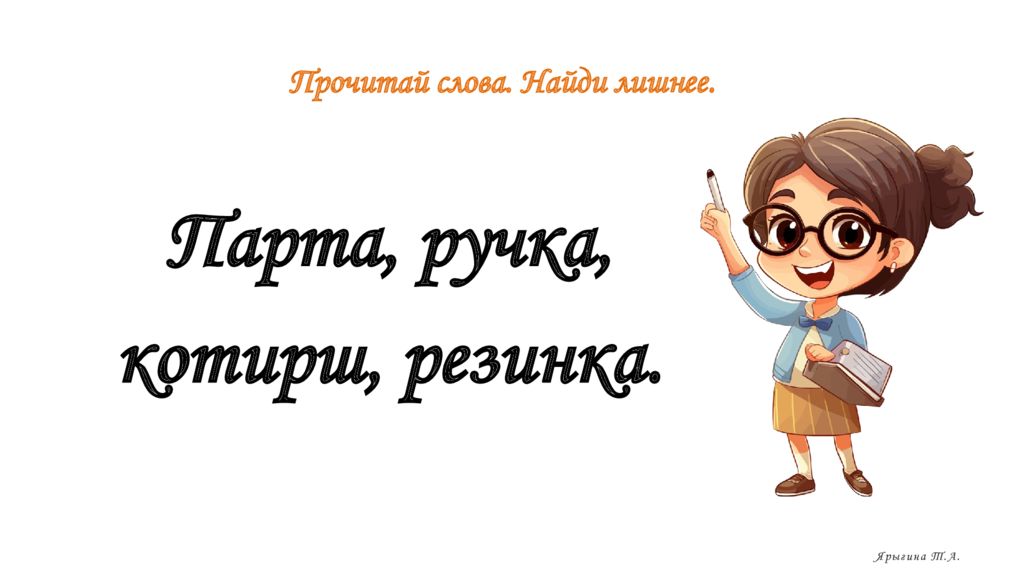 Прочитай слова. Найди лишнее. Парта, ручка, котирш, резинка. Ярыгина Т.А.