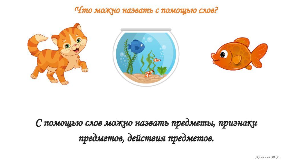 Что можно назвать с помощью слов ? С помощью слов можно назвать предметы, признаки предметов, действия предметов. Ярыгина Т.А.