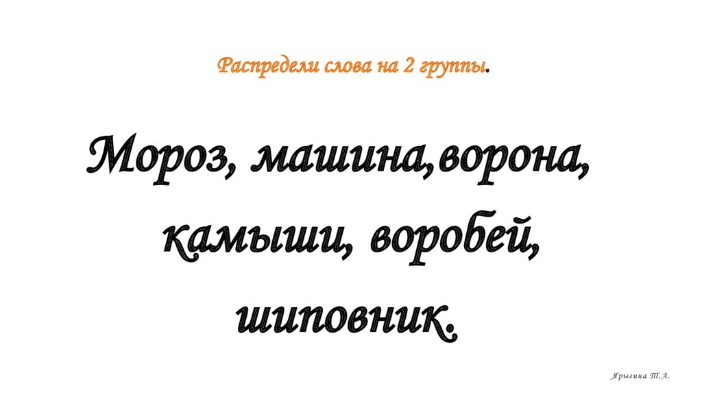 Распредели слова на 2 группы. Мороз, машина,ворона, камыши, воробей, шиповник. Ярыгина Т.А.
