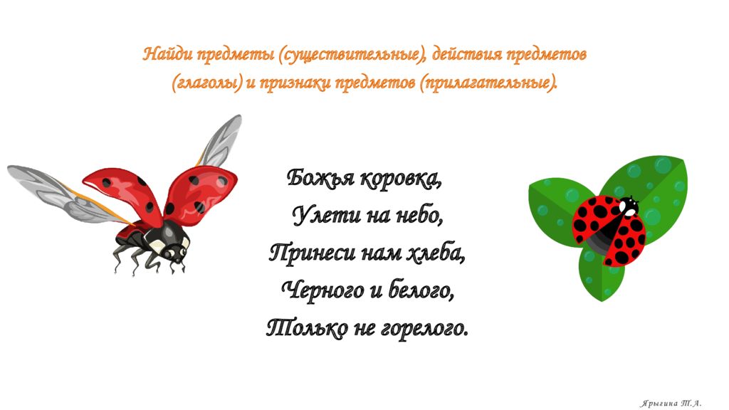 Божья коровка, Улети на небо, Принеси нам хлеба, Черного и белого, Только не горелого. Найди предметы ( существительные ), действия предметов ( глаголы ) и признаки предметов ( прилагательные ). Ярыгина Т.А.