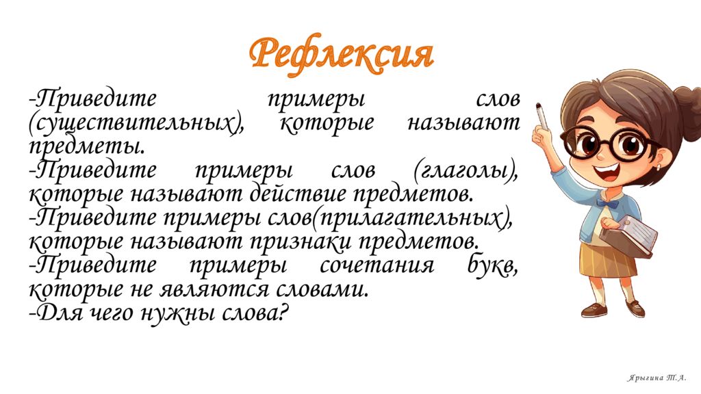 Рефлексия Ярыгина Т.А. - Приведите примеры слов ( существительных ), которые называют предметы. - Приведите примеры слов ( глаголы ), которые называют действие предметов. - Приведите примеры слов ( прилагательных ), которые называют признаки предметов. - Приведите примеры сочетания букв, которые не являются словами. - Для чего нужны слова ?