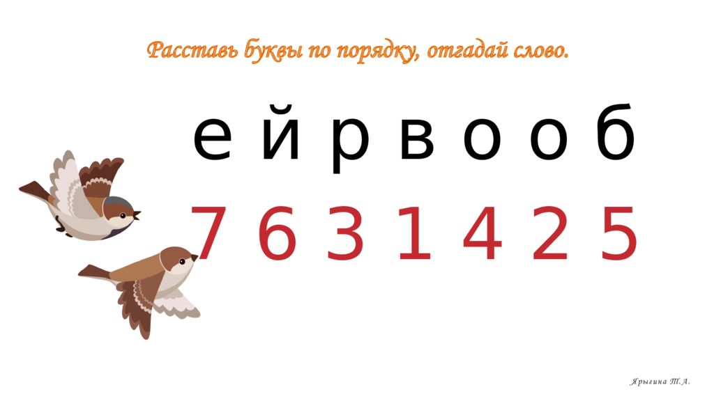 Расставь буквы по порядку, отгадай слово. е й р в о о б 7 6 3 1 4 2 5 Ярыгина Т.А.