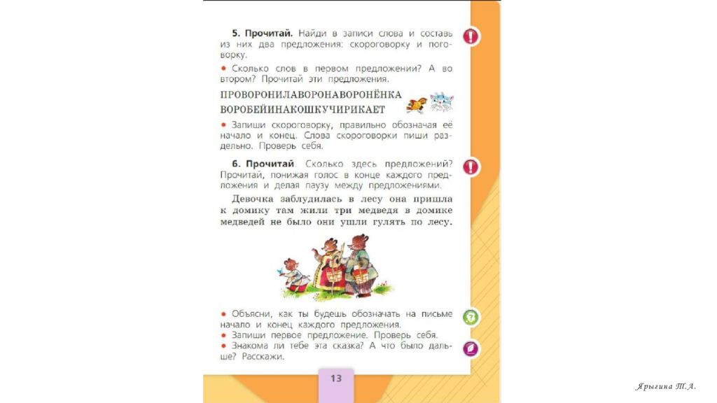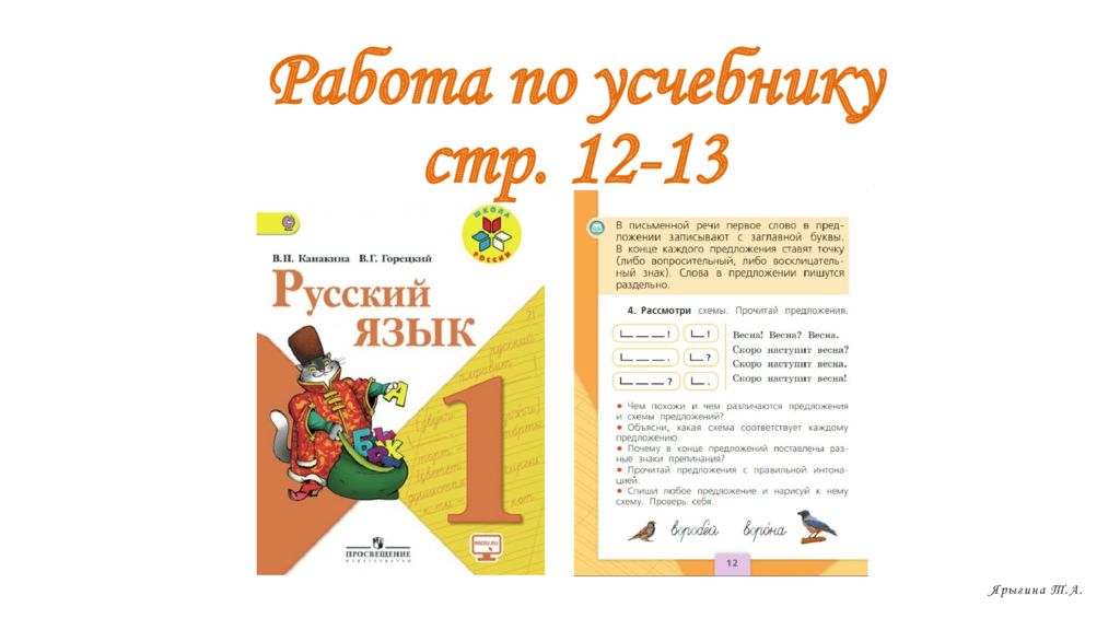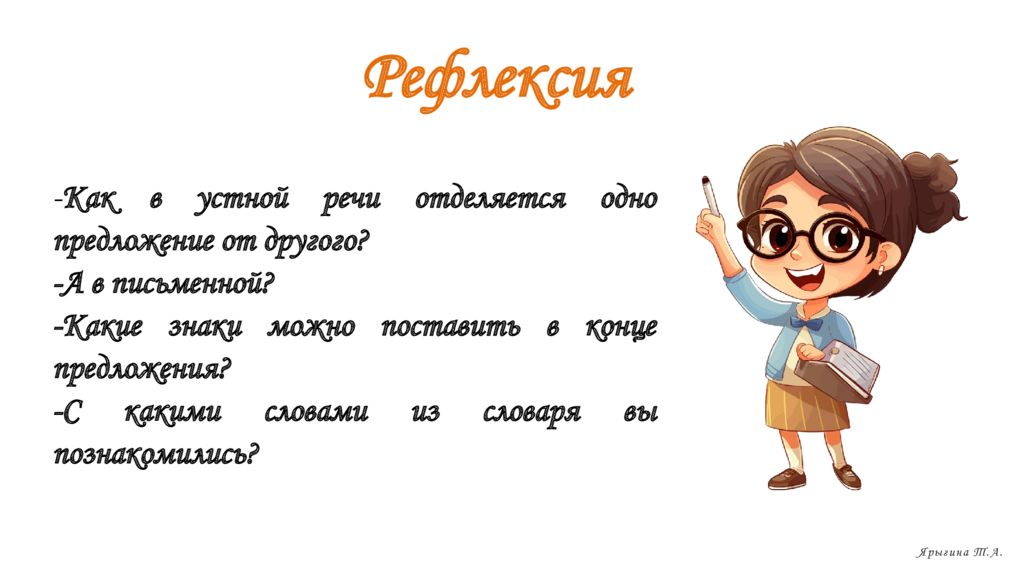 - Как в устной речи отделяется одно предложение от другого ? -А в письменной ? - Какие знаки можно поставить в конце предложения ? -С какими словами из словаря вы познакомились ? Рефлексия Ярыгина Т.А.