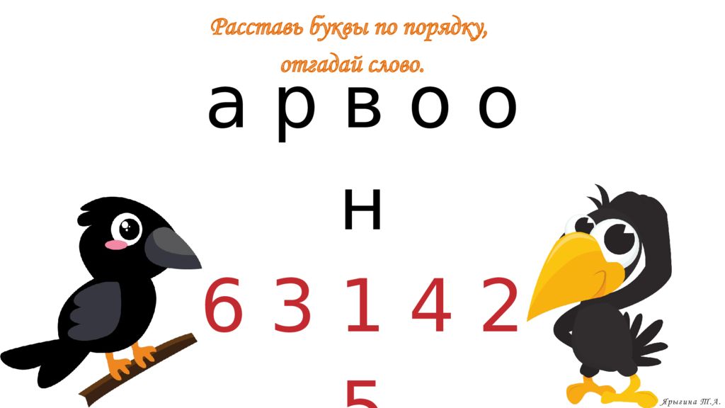 Расставь буквы по порядку, отгадай слово. а р в о о н 6 3 1 4 2 5 Ярыгина Т.А.