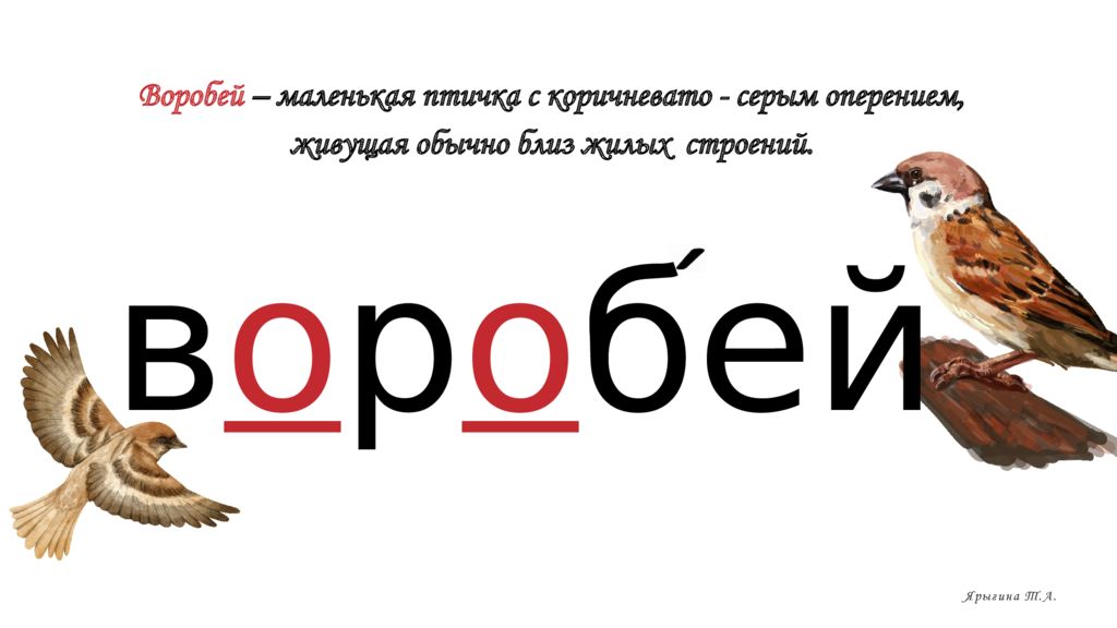 в о р о бей Воробей – маленькая птичка с коричневато - серым оперением, живущая обычно близ жилых строений. Ярыгина Т.А.