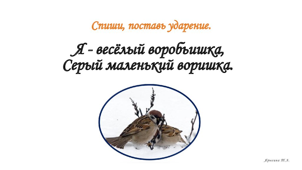 Спиши, поставь ударение. Я - весёлый воробьишка, Серый маленький воришка. Ярыгина Т.А.