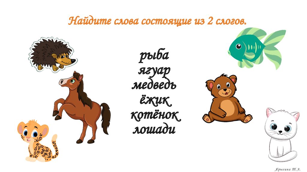 Найдите слова состоящие из 2 слогов. рыба ягуар медведь ёжик котёнок лошади Ярыгина Т.А.