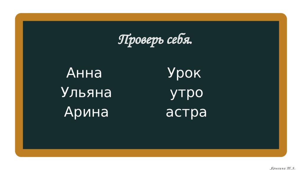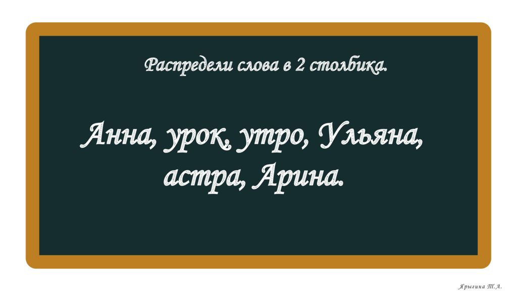 Распредели слова в 2 столбика. Анна, урок, утро, Ульяна, астра, Арина. Ярыгина Т.А.