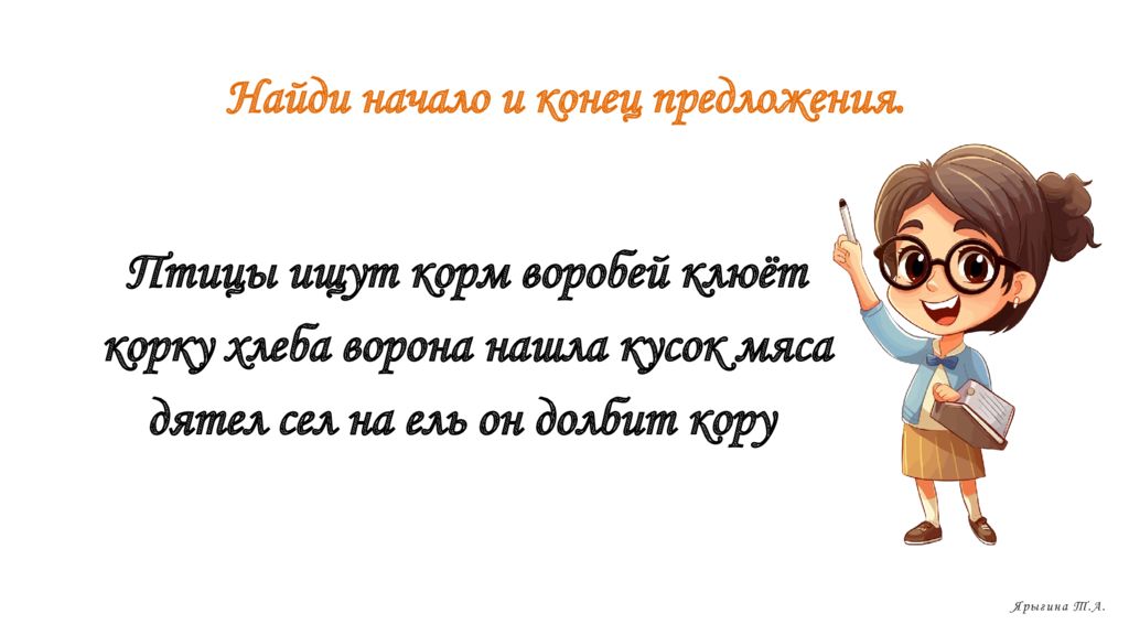 Найди начало и конец предложения. Птицы ищут корм воробей клюёт корку хлеба ворона нашла кусок мяса дятел сел на ель он долбит кору Ярыгина Т.А.