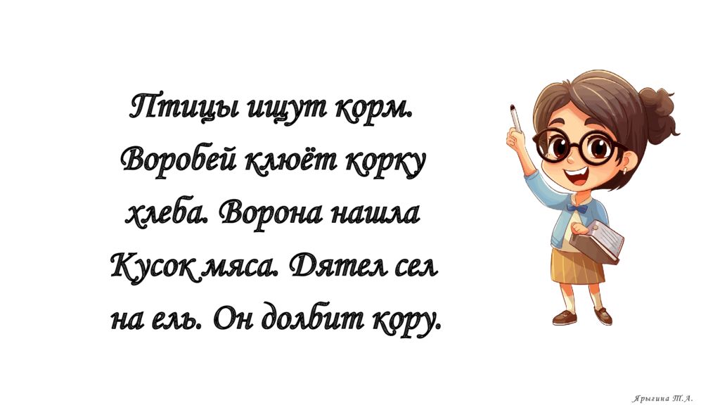 Птицы ищут корм. Воробей клюёт корку хлеба. Ворона нашла Кусок мяса. Дятел сел на ель. Он долбит кору. Ярыгина Т.А.