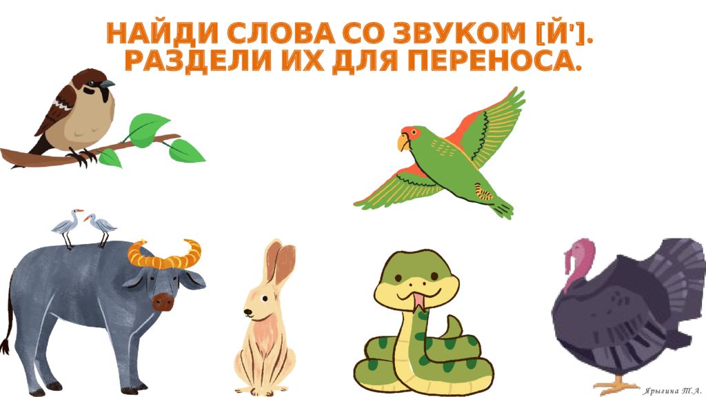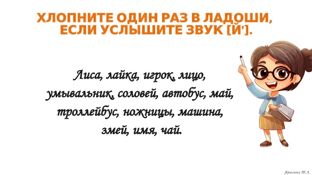 ХЛОПНИТЕ ОДИН РАЗ В ЛАДОШИ, ЕСЛИ УСЛЫШИТЕ ЗВУК [Й']. Лиса, лайка, игрок, лицо, умывальник, соловей, автобус, май, троллейбус, ножницы, машина, змей, имя, чай. Ярыгина Т.А.