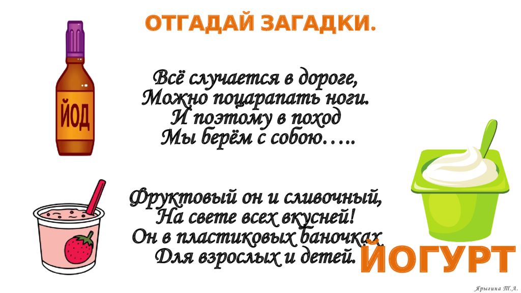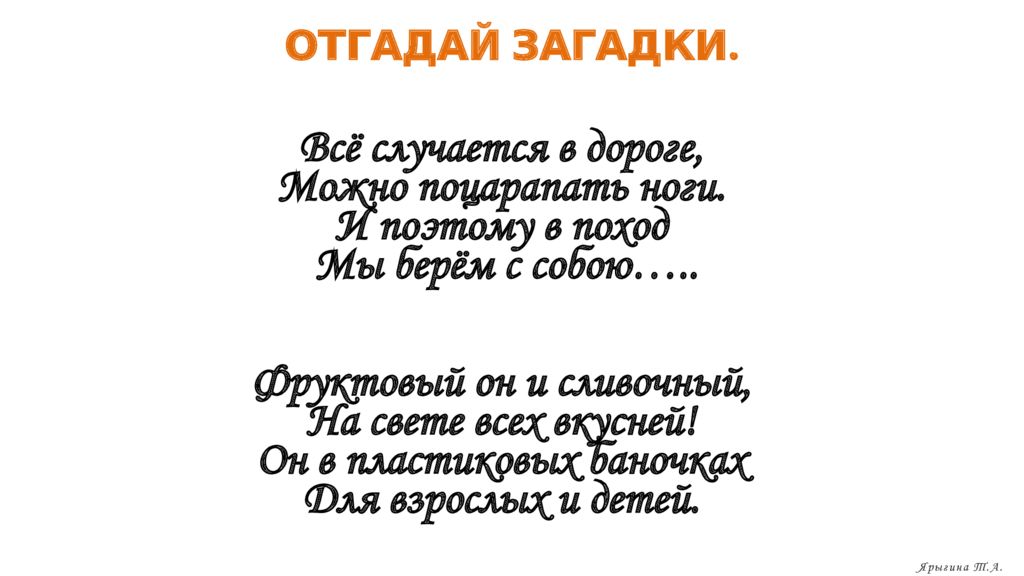 ОТГАДАЙ ЗАГАДКИ. Всё случается в дороге, Можно поцарапать ноги. И поэтому в поход Мы берём с собою….. Фруктовый он и сливочный, На свете всех вкусней ! Он в пластиковых баночках Для взрослых и детей. Ярыгина Т.А.