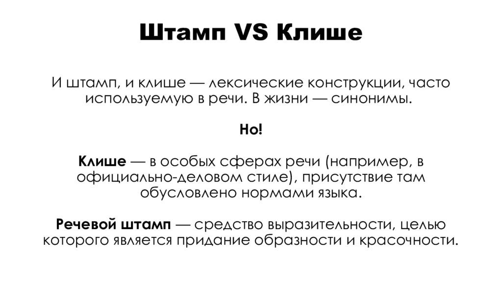 И штамп, и клише — лексические конструкции, часто используемую в речи. В жизни — синонимы. Но! Клише — в особых сферах речи (например, в официально-деловом стиле), присутствие там обусловлено нормами языка. Речевой штамп — средство выразительности, целью которого является придание образности и красочности.