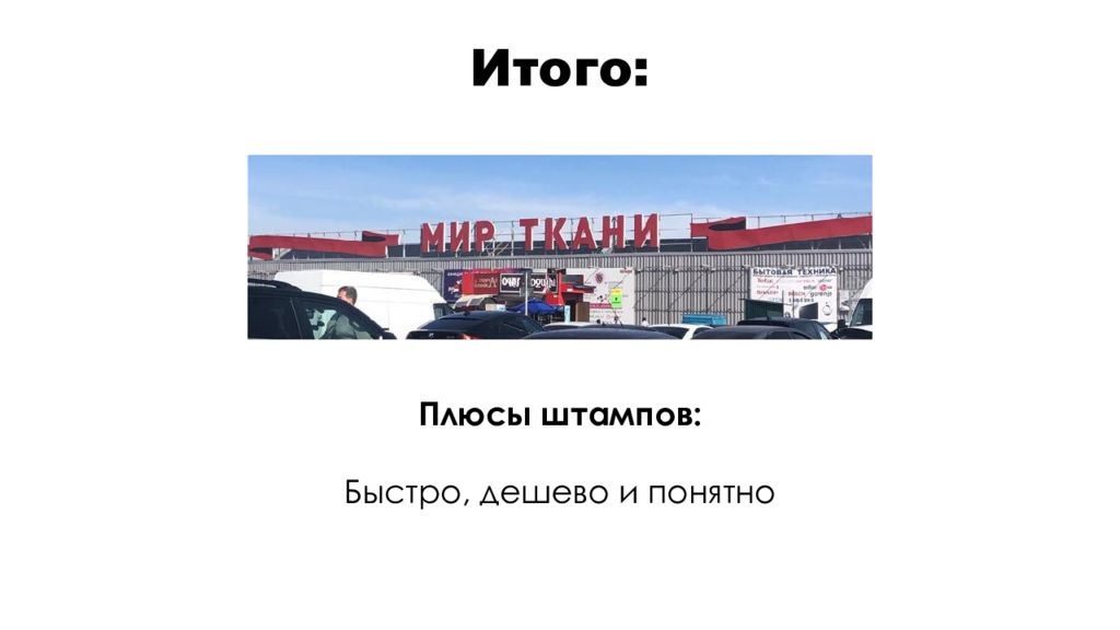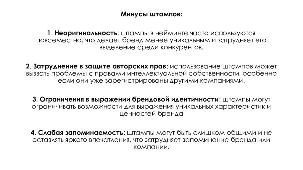 Минусы штампов : 1. Неоригинальность : штампы в нейминге часто используются повсеместно, что делает бренд менее уникальным и затрудняет его выделение среди конкурентов. 2. Затруднение в защите авторских прав : использование штампов может вызвать проблемы с правами интеллектуальной собственности, особенно если они уже зарегистрированы другими компаниями. 3. Ограничения в выражении брендовой идентичности : штампы могут ограничивать возможности для выражения уникальных характеристик и ценностей бренда 4. Слабая запоминаемость : штампы могут быть слишком общими и не оставлять яркого впечатления, что затрудняет запоминание бренда или компании.