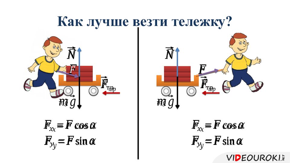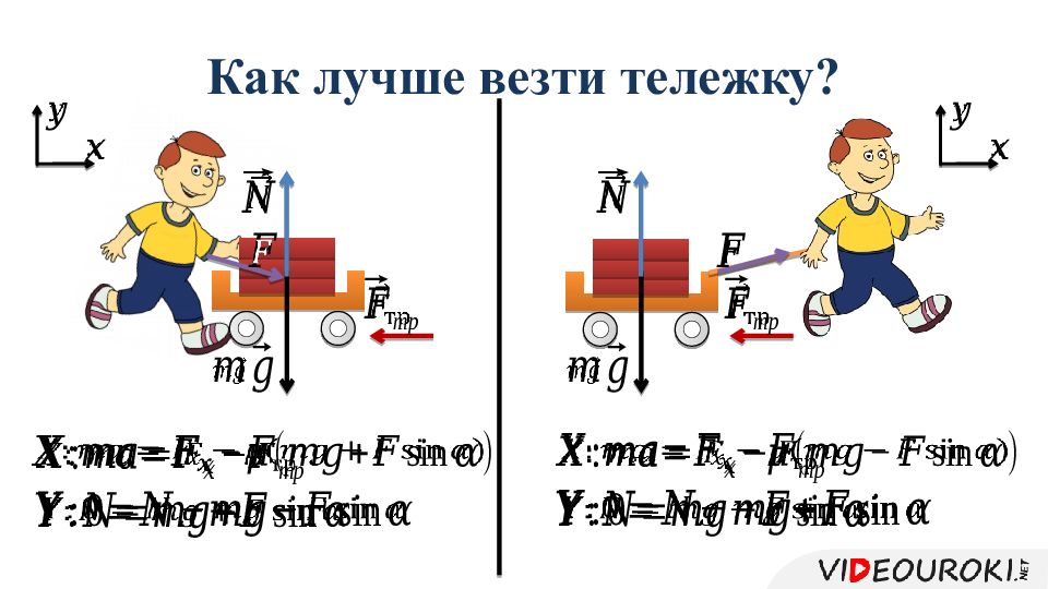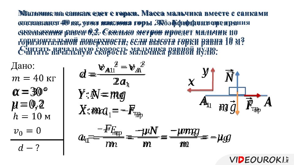 Слайд 10: Мальчик на санках едет с горки. Масса мальчика вместе с санками составляет 40 кг, угол наклона горы. Найдите ускорение, с которым съезжает мальчик, если коэффициент трения скольжения равен 0,2