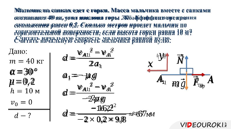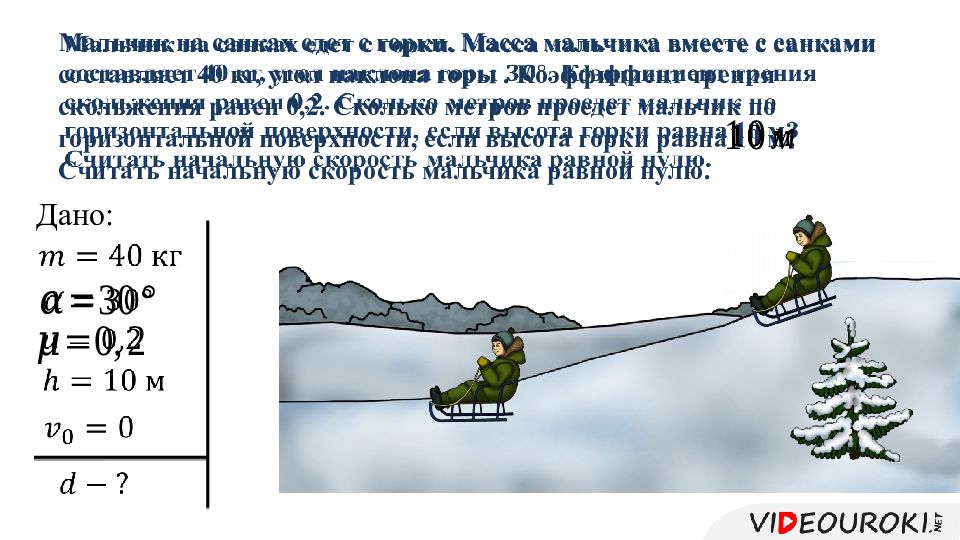 Слайд 13: Мальчик на санках едет с горки. Масса мальчика вместе с санками составляет 40 кг, угол наклона горы. К оэффициент трения скольжения равен 0,2. Сколько метров проедет мальчик по горизонтальной поверхности, если высота горки равна 10 м? Считать начальную скорость мальчика равной нулю