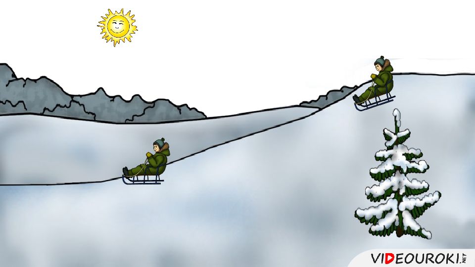 Слайд 14: Мальчик на санках едет с горки. Масса мальчика вместе с санками составляет 40 кг, угол наклона горы. К оэффициент трения скольжения равен 0,2. Сколько метров проедет мальчик по горизонтальной поверхности, если высота горки равна 10 м? Считать начальную скорость мальчика равной нулю