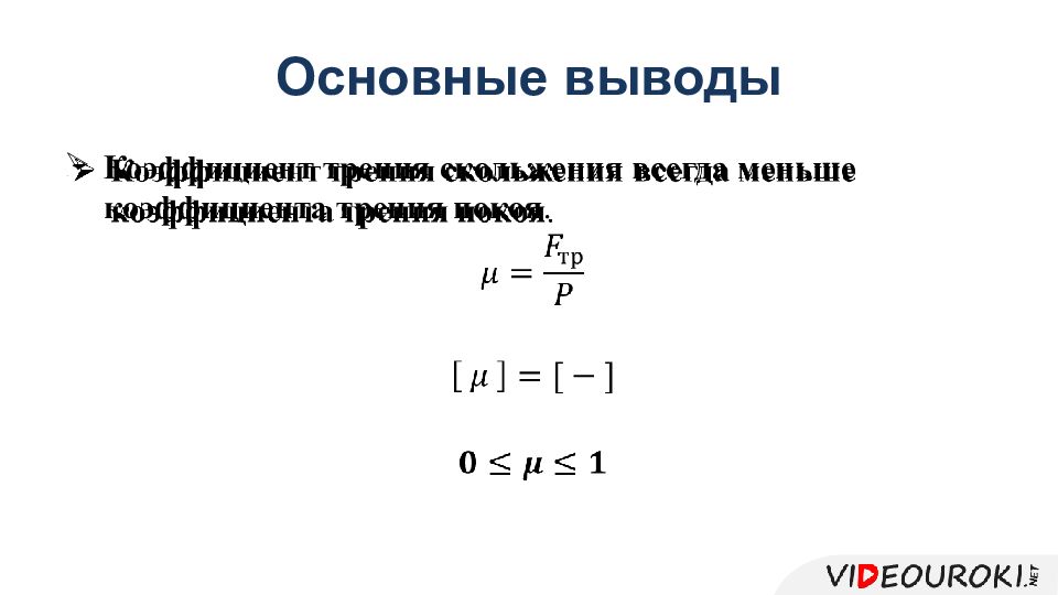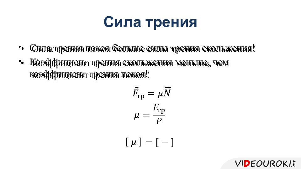 Сила трения покоя больше силы трения скольжения! Коэффициент трения скольжения меньше, чем коэффициент трения покоя!