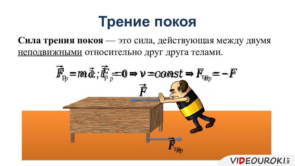 Сила трения всегда препятствует движению. Сила трения возникает между двумя соприкасающимися телами. Сила трения покоя возникает между двумя соприкасающимися, неподвижными относительно друг друга телами. Сила трения скольжения возникает между двумя соприкасающимися телами, двигающимися относительно друг друга.