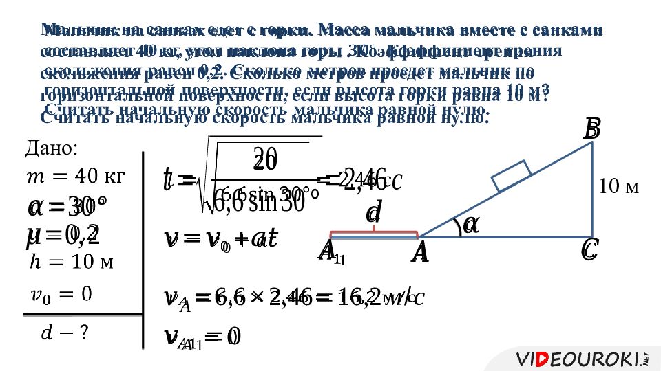 Слайд 16: Мальчик на санках едет с горки. Масса мальчика вместе с санками составляет 40 кг, угол наклона горы. К оэффициент трения скольжения равен 0,2. Сколько метров проедет мальчик по горизонтальной поверхности, если высота горки равна 10 м? Считать начальную скорость мальчика равной нулю