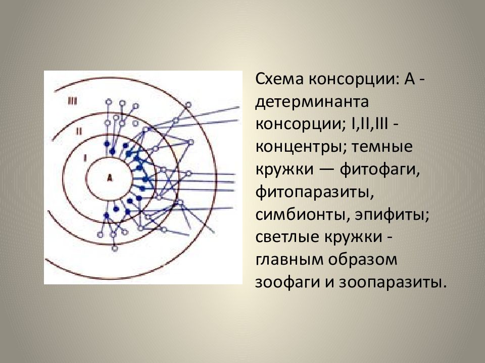 Схема консорции : А - детерминанта консорции ; I,II,III - концентры; темные кружки — фитофаги, фитопаразиты, симбионты, эпифиты; светлые кружки - главным образом зоофаги и зоопаразиты.