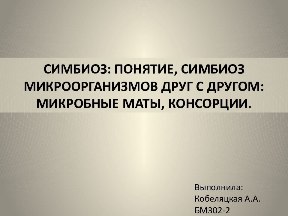 СИМБИОЗ: ПОНЯТИЕ, СИМБИОЗ МИКРООРГАНИЗМОВ ДРУГ С ДРУГОМ: МИКРОБНЫЕ МАТЫ, КОНСОРЦИИ. Выполнила: Кобеляцкая А.А. БМ302-2