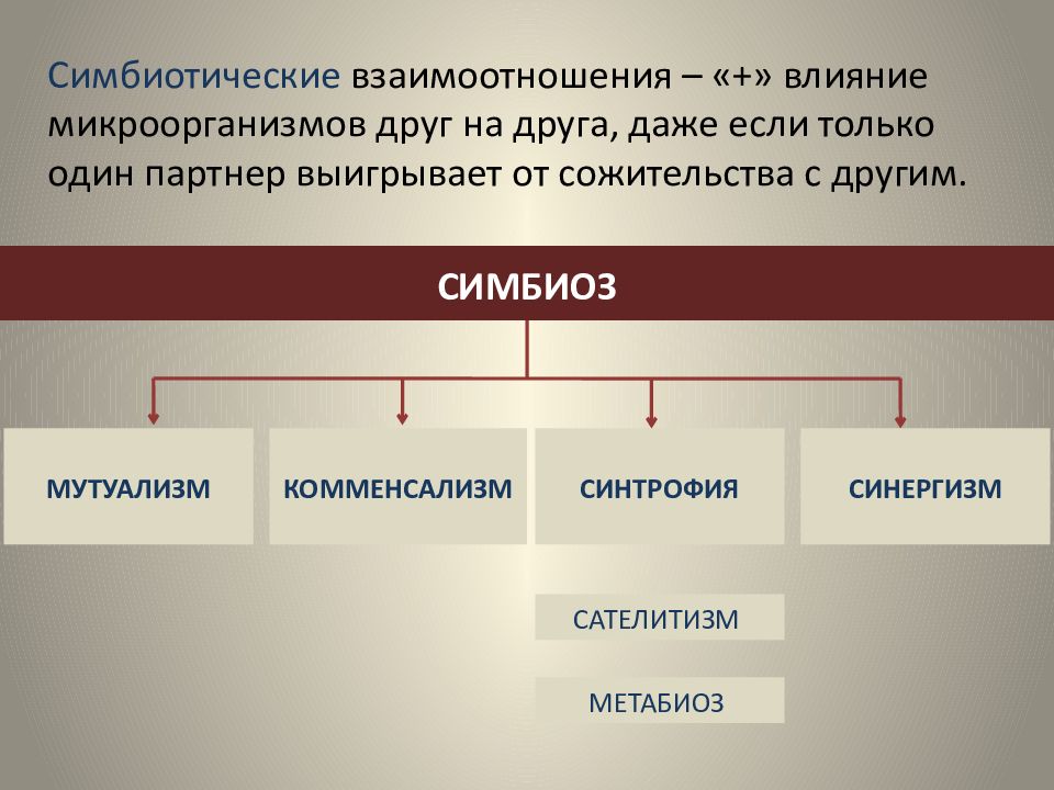Симбиотические взаимоотношения – «+» влияние микроорганизмов друг на друга, даже если только один партнер выигрывает от сожительства с другим. САТЕЛИТИЗМ МЕТАБИОЗ СИМБИОЗ МУТУАЛИЗМ КОММЕНСАЛИЗМ СИНТРОФИЯ СИНЕРГИЗМ