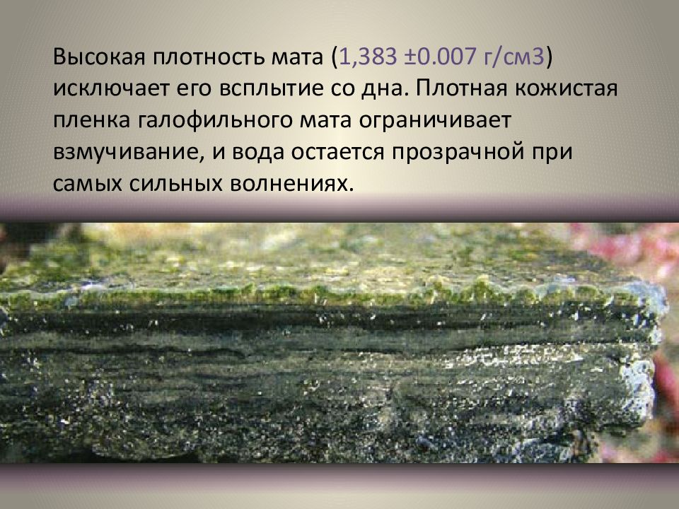 Высокая плотность мата ( 1,383 ±0.007 г/см3 ) исключает его всплытие со дна. Плотная кожистая пленка галофильного мата ограничивает взмучивание, и вода остается прозрачной при самых сильных волнениях.